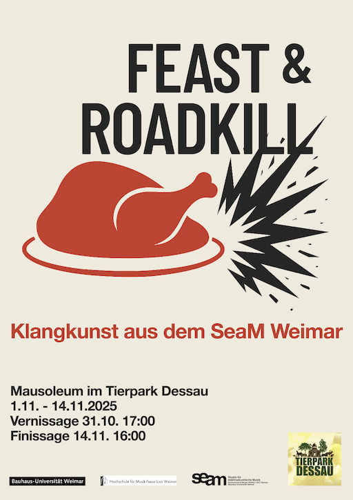 Studierende des SeaMs (Studio für Elektroakustische Musik der Hochschule für Musik Franz Liszt und der Bauhaus-Universität Weimar) entwickelten im Sommersemester 2025 im Rahmen des Projektmoduls Feast & Roadkill eigens für die Ausstellung im Mausoleum des Tierparks Dessau eine vielfältige Sammlung klangkünstlerischer Arbeiten rund um das Thema „Tote Tiere“.